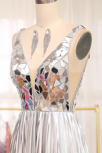 Sparkly A Line Deep V Neck Silver Long Prom Dress with Beading