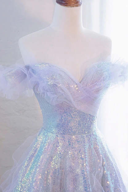 Sparkly Light Blue Off the Shoulder Sequin Long Prom Dress with Ruffles