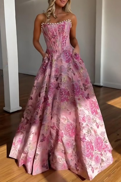 Sparkly Grey Blue Flower Strapless A-Line Long Corset Prom Dress with Beading
